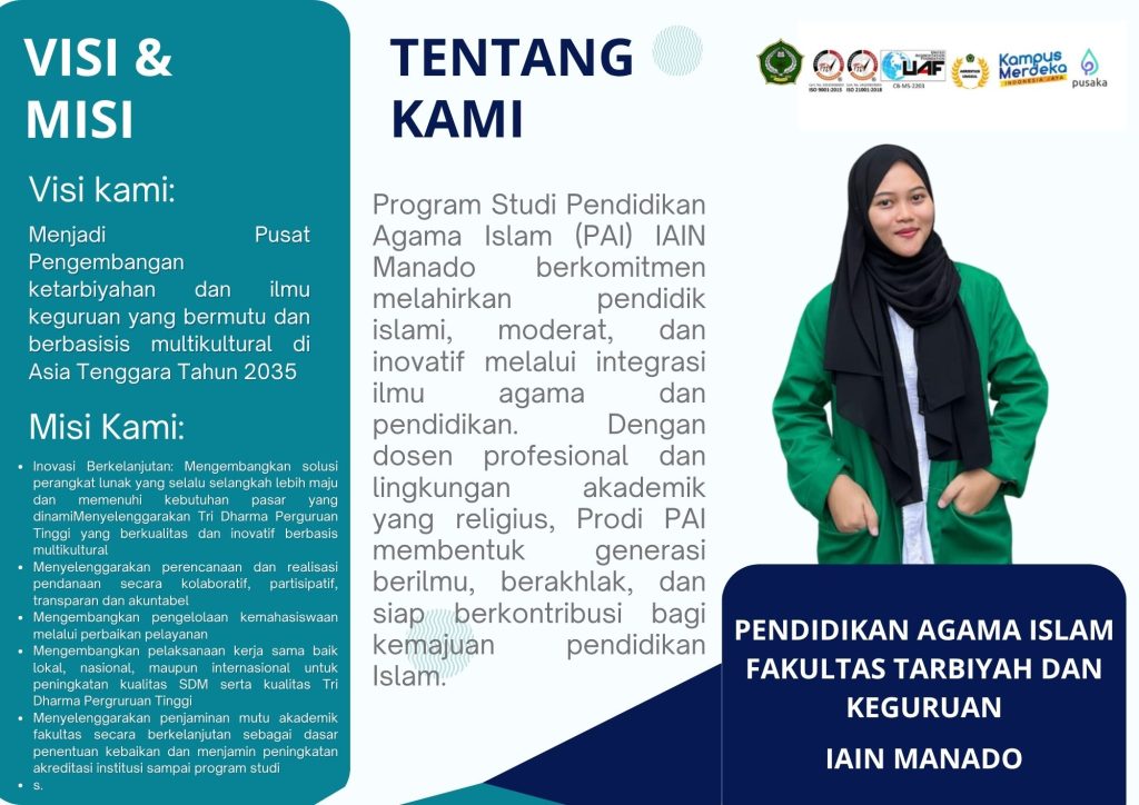 Program Studi Pendidikan Agama Islam (PAI) IAIN Manado hadir sebagai wadah pengembangan keilmuan dan ketarbiyahan yang berorientasi pada mutu, inovasi, serta semangat multikultural. Dengan komitmen yang kuat terhadap kualitas akademik dan nilai-nilai keislaman yang moderat, Prodi PAI bertekad menjadi pusat pengembangan ketarbiyahan dan ilmu keguruan yang bermutu dan berbasis multikultural di Asia Tenggara pada tahun 2035.
